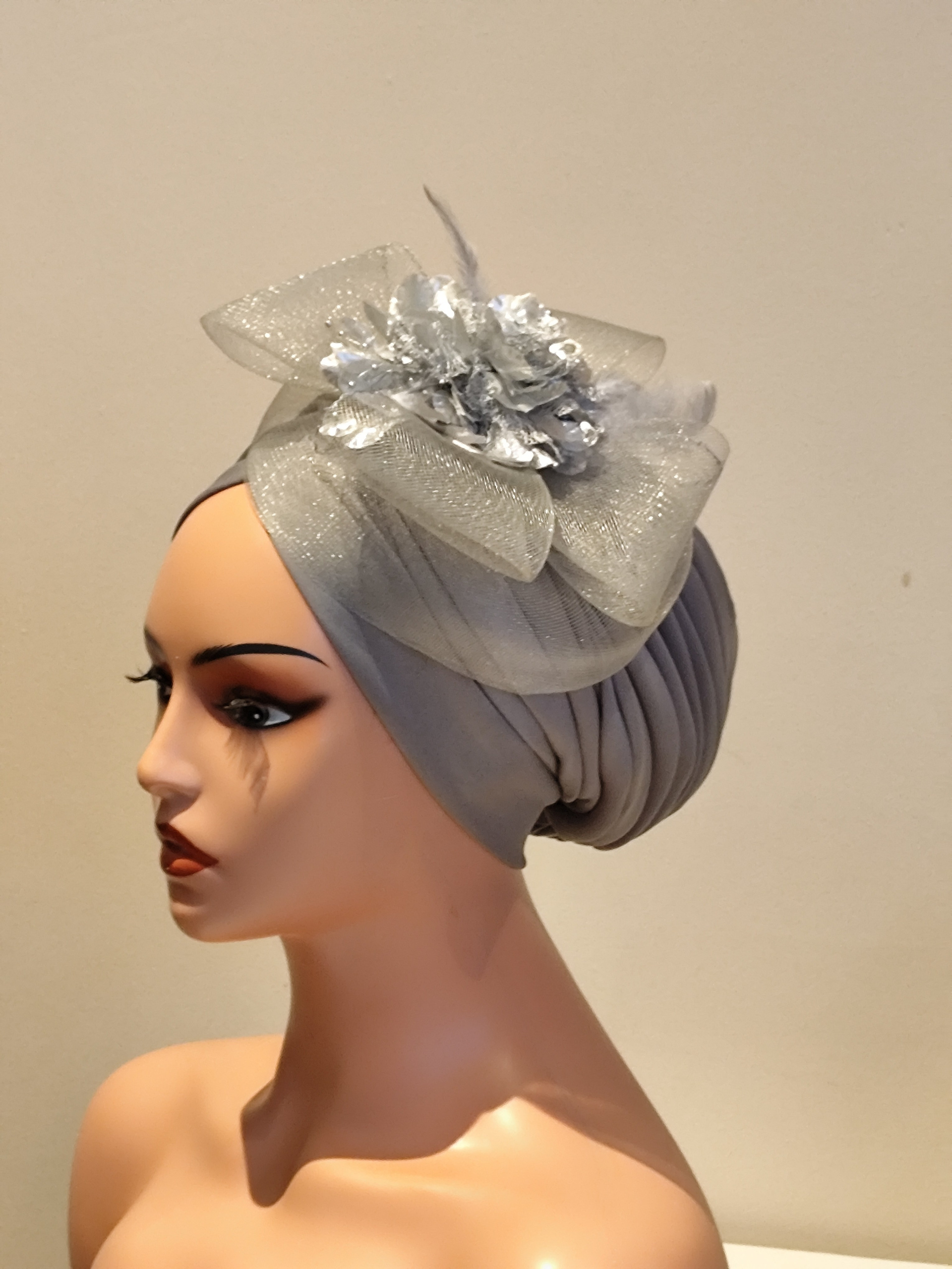 A pleated turban cap with an attached fascinator.